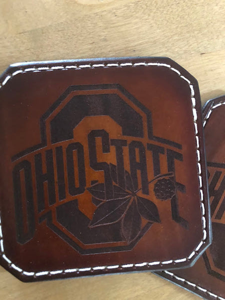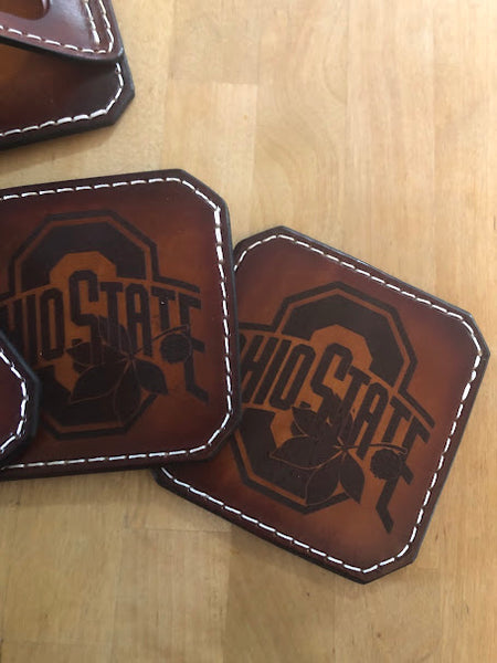 Step into your favorite saloon—or your front porch—with confidence, knowing your surfaces are protected by a set of 4 handcrafted leather coasters, each etched with Ohio State grit via precise laser engraving.