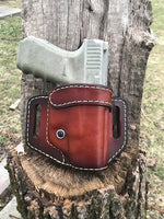 This is an outside waistband holster. Built for comfort and concealment this holster is made from 7-9 oz Veg tan leather. Belt loops are made to handle up to a 2" belt and placed to give you options on placement. You can use the belt loops across from each other to carry straight vertical or us the loops slanted from each other to give you a cant to be worn a little further back between the 3 o'clock position and 5 o'clock position. If you like to be able to carry in multiple locations this is the holster you want.